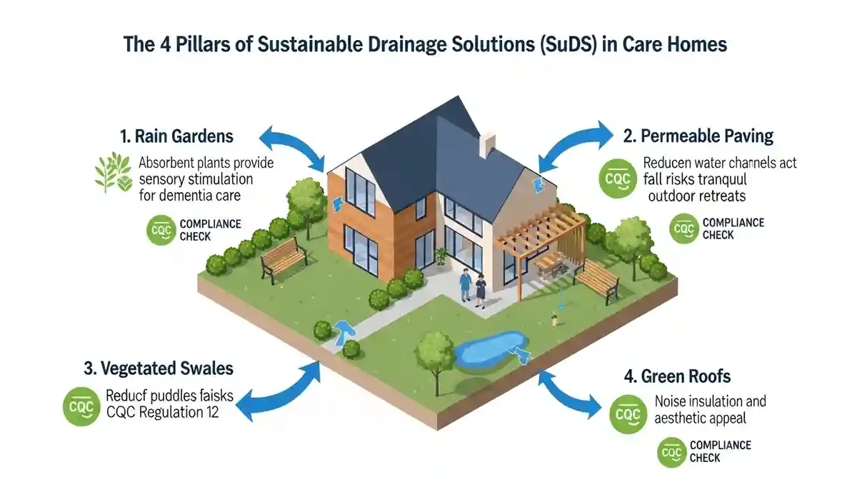 The future of sustainable drainage solutions CQC care home design is the integration of SuDS (Sustainable Drainage Systems). In High Wycombe, Policy EN18 of the Local Plan encourages SuDS to manage surface water runoff, which often plagues the surrounding area.